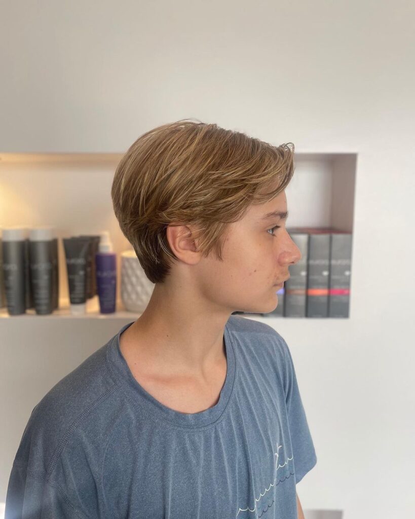 Simple Haircut on Chocolate Hair: This timeless haircut is a great choice for boys with chocolate or golden hair. The hair is trimmed evenly all around, creating a clean and neat appearance that’s easy to maintain.