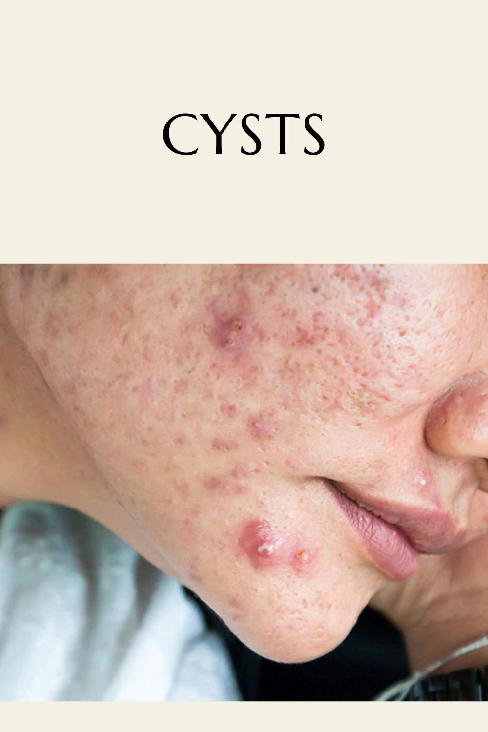 Cysts are further deep in the skin than nodules. They look like big white or red bumps that hurt when touched.